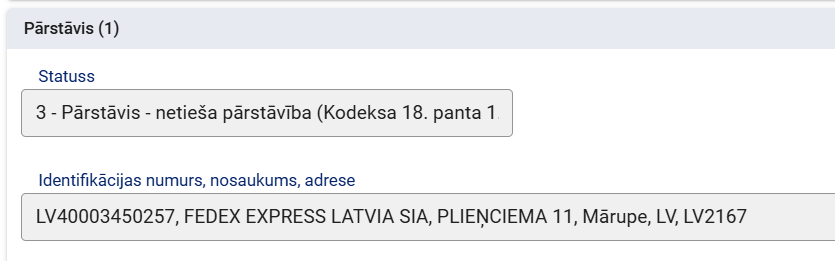 Izmantojot tiešo pārstāvību, pārstāvis muitā rīkojas citas personas vārdā un tās uzdevumā. Deklarētājs un pārstāvis ir atšķirīgas personas un ailē “Pārstāvis” norāda, piemēram, eksportētāju. Šajā gadījumā laukā “Statuss” jānorāda 2 - Pārstāvis - tiešā pārstāvība.