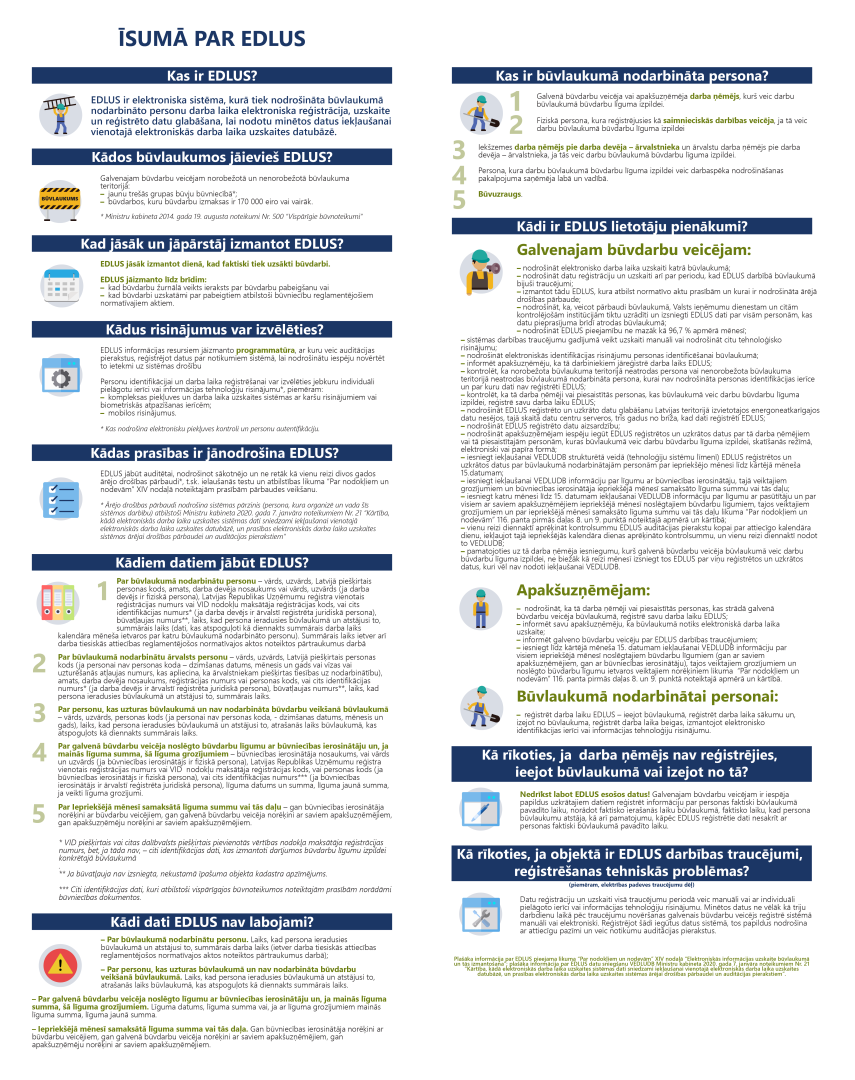 Elektroniskās darba laika uzskaites sistēmas (EDLUS) ieviešanas mērķis ir būvniecības nozares sakārtošana: uzlabot nodokļu nomaksu par nodarbinātajiem, novērst nekorekta darba laika uzskaiti un uzlabot saimnieciskās darbības izsekojamību.