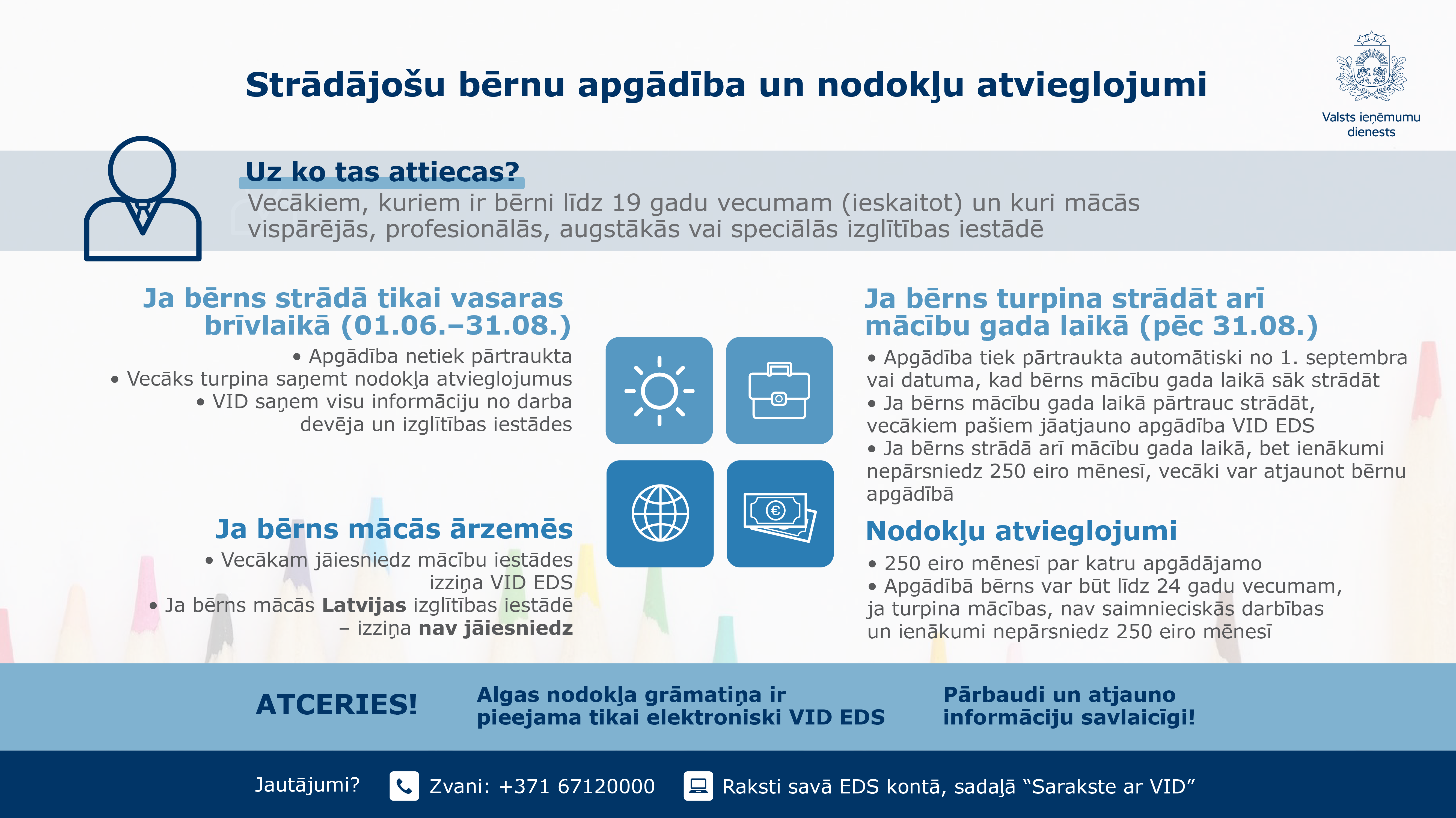 Beidzoties vasaras brīvlaikam, kurā daudzi skolēni arī strādāja, atgādinām par nodokļu atvieglojumu piemērošanas nosacījumiem tiem vecākiem, kam ir bērni vecumā līdz 19 gadiem (ieskaitot) un kuri mācās vispārējās, profesionālās, augstākās vai speciālās izglītības iestādē.